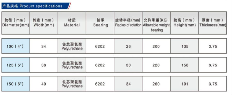產(chǎn)品特點:焊接工藝?yán)喂?,聚氨酯附著力?qiáng),耐磨性好,滾動阻力小,轉(zhuǎn)向靈活性好,軸承輪轂堅固。